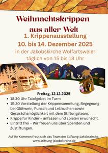 Die Arbeitsgruppe des Stiftungsfonds Jakobskirche lädt herzlich zur Krippenausstellung nach Wolfartsweier in die Ev. Jakobskirche ein. Von 10 bis 14. Dezember gibt es mehr als 10 Krippen aus aller Welt zu sehen. Auch eine Krippe die von Kindern bespielt und angefasst werden darf wird darunter sein.