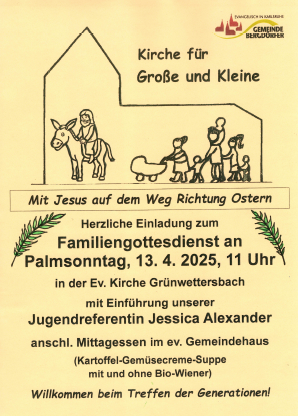 Herzliche Einladung zum Familiengottesdienst an Palmsonntag, 13.04.2025, um 11 Uhr in der Ev. Kirche in Grünwettersbach