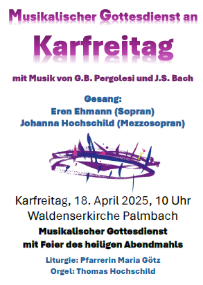 Herzliche Einladung zum musikalischen Gottesdienst mit Feier des heiligen Abendmahls an Karfreitag, 18.04.2025 um 10:00 Uhr in der Waldenserkirche Palmbach
