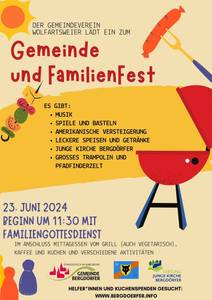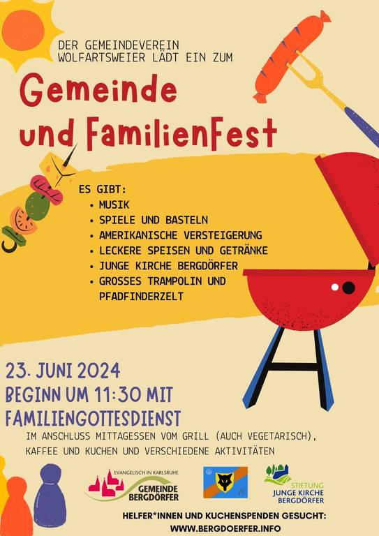 Es ist wieder so weit: Der Gemeindeverein Wolfartsweier lädt ein: Wir feiern ein großes Gemeindefest. Eröffnung ist am Sonntag 23. Juni um 11:30 mit Familiengottesdienst. Mit Mittagessen vom Grill, Kuchenbüffet und verschiedenen Aktivitäten für Kinder und solche die es geblieben sind, wird der Nachmittag angefüllt.