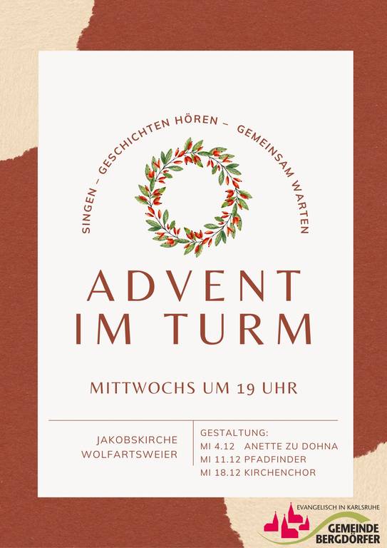 Gemeinsam im Advent das Warten üben, mit Geschichten, mit Liedern, mit Gebeten und bei Kerzenschein dazu laden wir in den Turmraum der Jakobskirche ein.