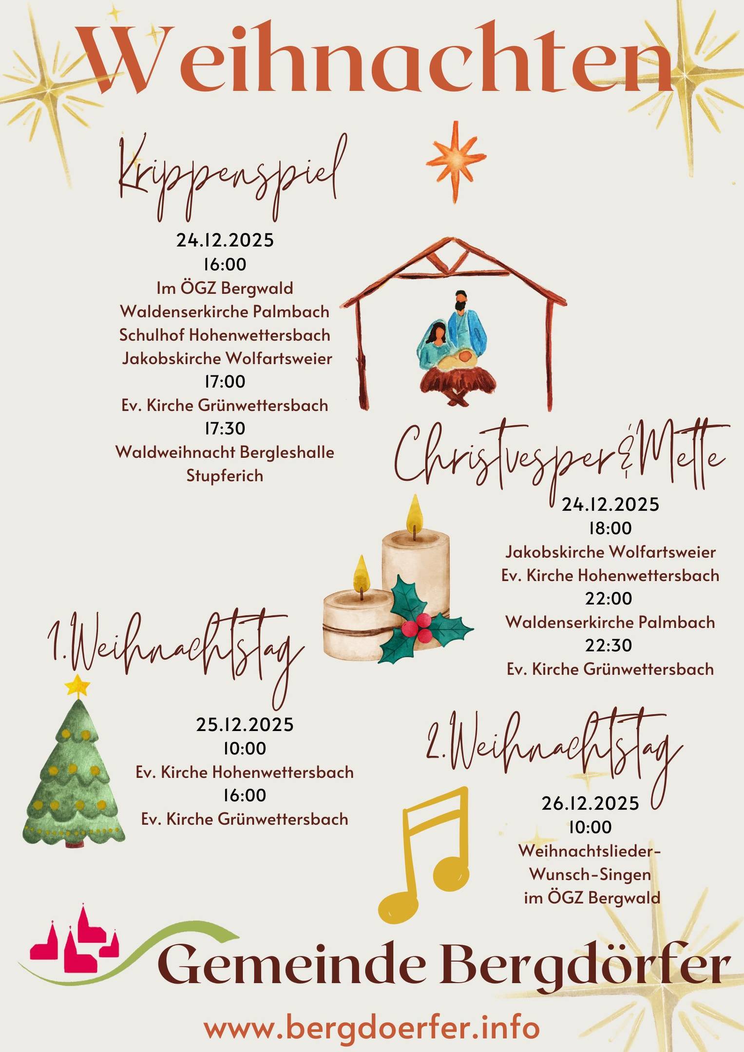 Herzliche Einladung zu den Weihnachtsgottesdiensten in der Region Bergdörfer
